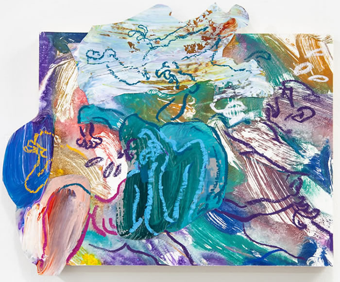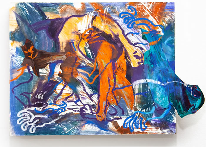 除此之外,他还通过拼贴元素进一步打破作品的边界:调色盘残骸被剪裁为不规则形状,转印复刻的亚克力版在肢解后被嵌入画面……龚若愚形容自己的创作为一种冥想与内观:“脑海中的场景就如同拼贴一样从来不是规则的,它的形状正契合了我的情绪边界。”