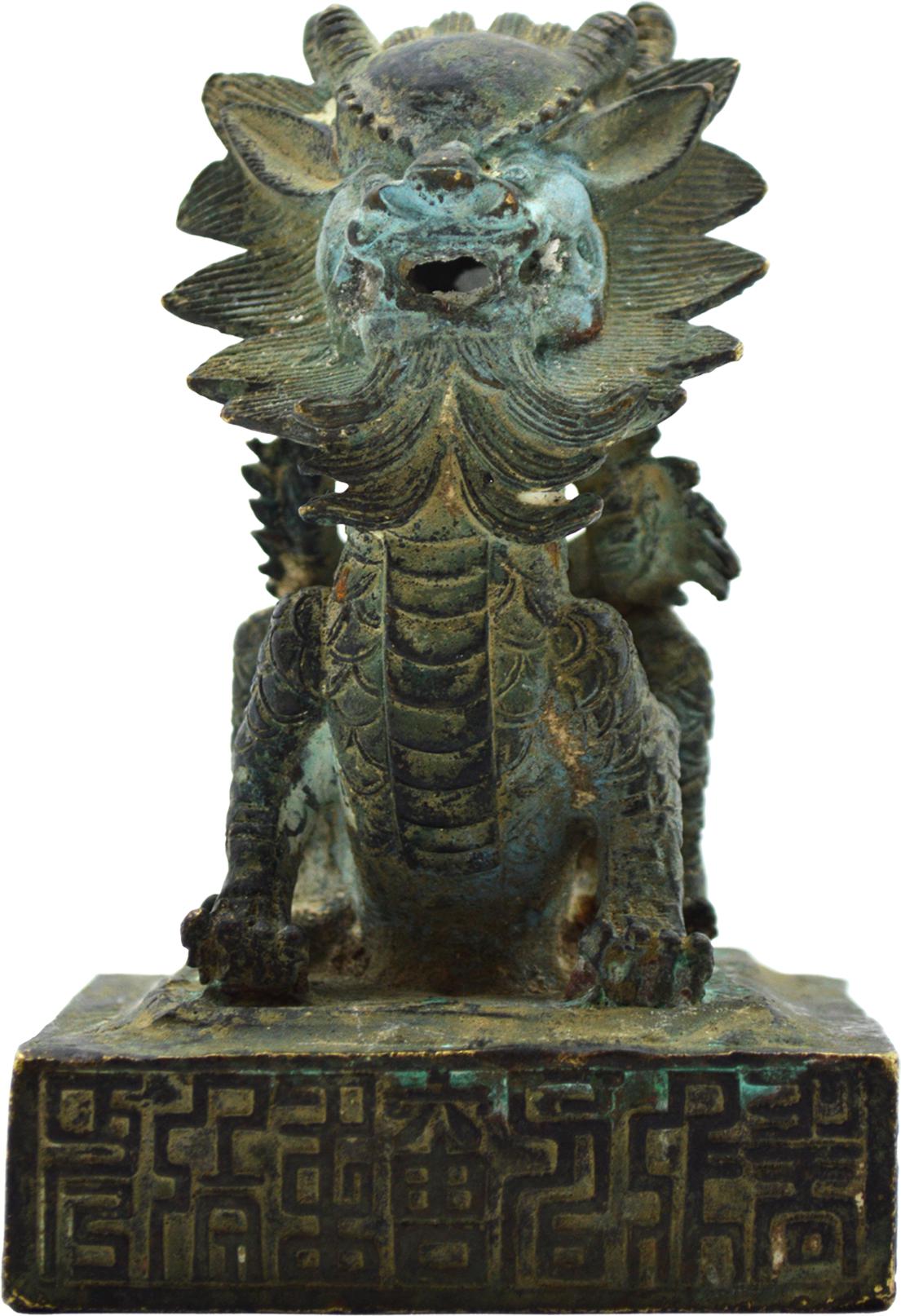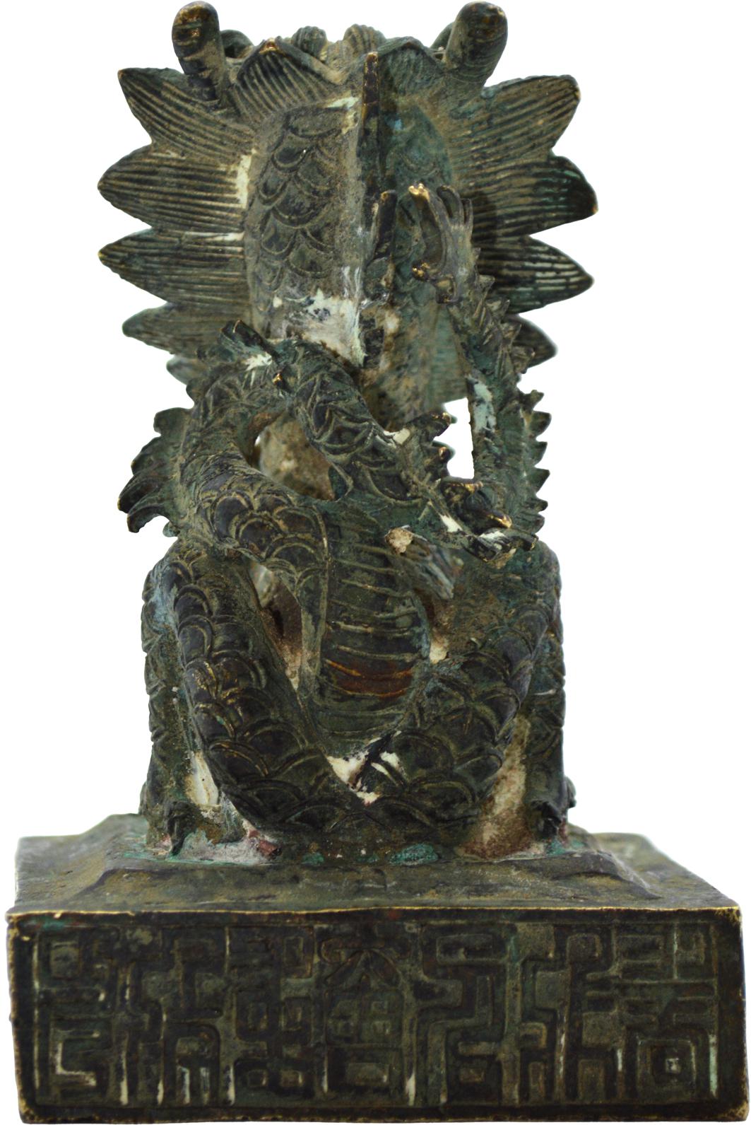 印章的钮部雕琢尤为引人注目,是一只盘踞的龙兽。它并非纯粹的皇家五爪龙形象,更可能是一种融合了龙、螭等神兽特征的瑞兽造型,体现了宋代工匠丰富的想象力与精湛的铸造技艺。兽身肌肉线条遒劲有力,姿态栩栩如生,或盘曲回旋,或昂首欲啸,虽静默无声,却仿佛蕴藏着撼动山河的力量。在宋代,龙兽不仅是皇权的象征,也广泛用于高级官员、文人雅士或宗教法事的印信之上,代表着持有者的身份、权威与吉祥护佑。
