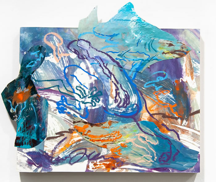 除此之外,他还通过拼贴元素进一步打破作品的边界:调色盘残骸被剪裁为不规则形状,转印复刻的亚克力版在肢解后被嵌入画面……龚若愚形容自己的创作为一种冥想与内观:“脑海中的场景就如同拼贴一样从来不是规则的,它的形状正契合了我的情绪边界。”